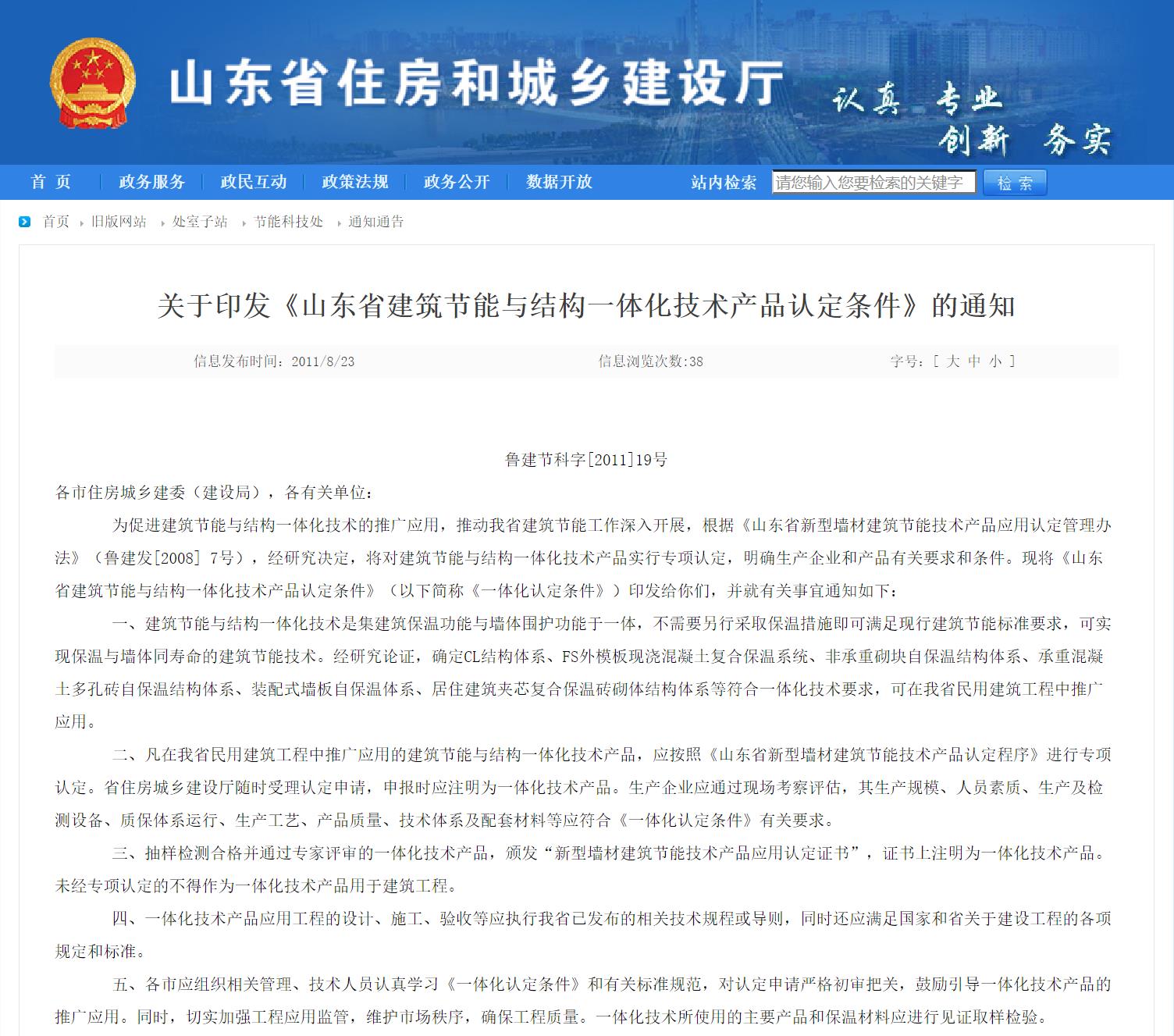山东:关于印发《山东省建筑节能与结构一体化技术产品认定条件》的通知